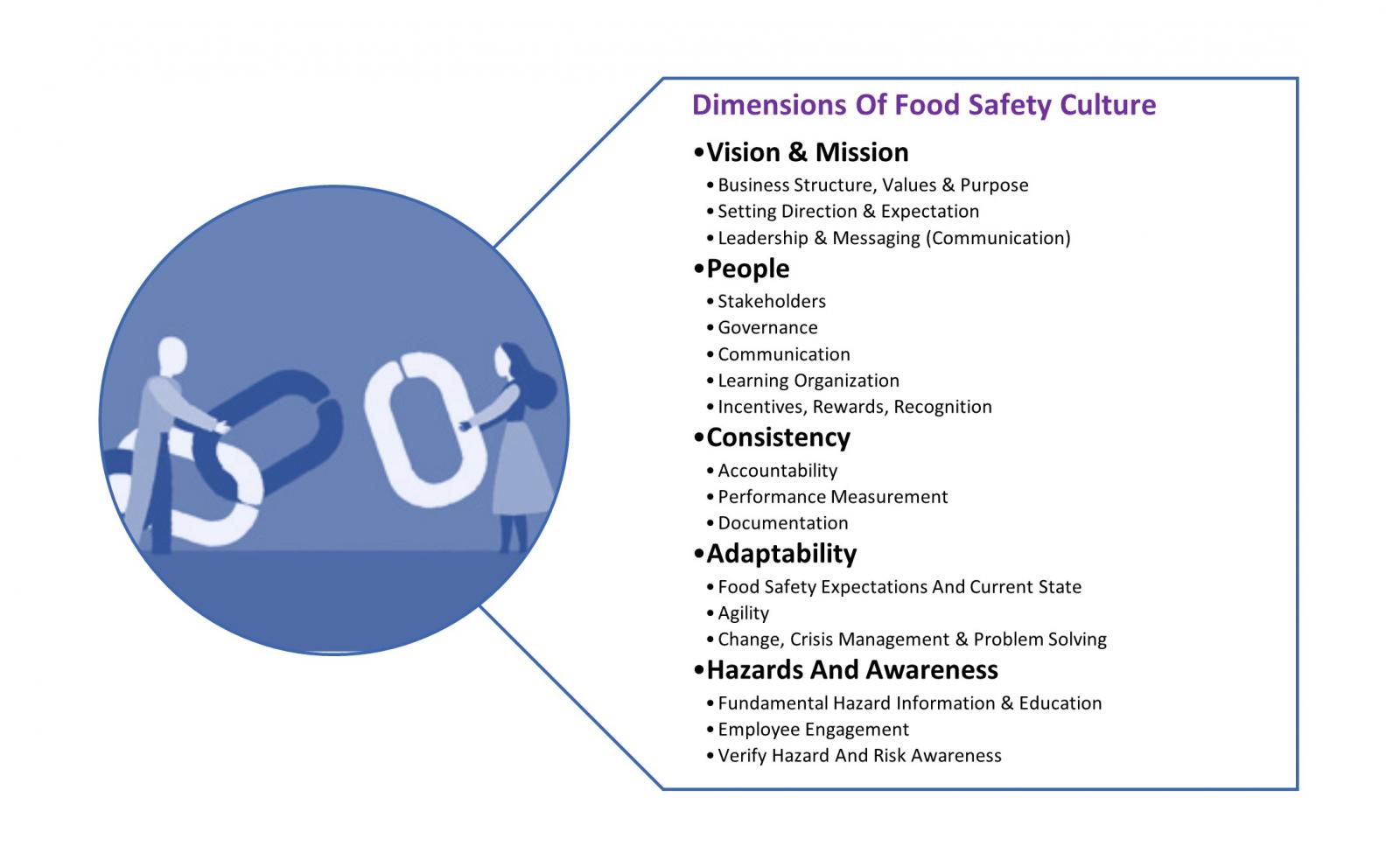 Based on an analysis of existing models used to evaluate food safety and organizational culture by Global food safety initiatives; following five dimensions were defined and explained. Each point below defines a specific dimension and explains why it is important to advancing a culture of food safety. These dimensions provide the information on critical content areas that an organization should examine if it wants to better understand its current food safety culture and make improvements to strengthen it.